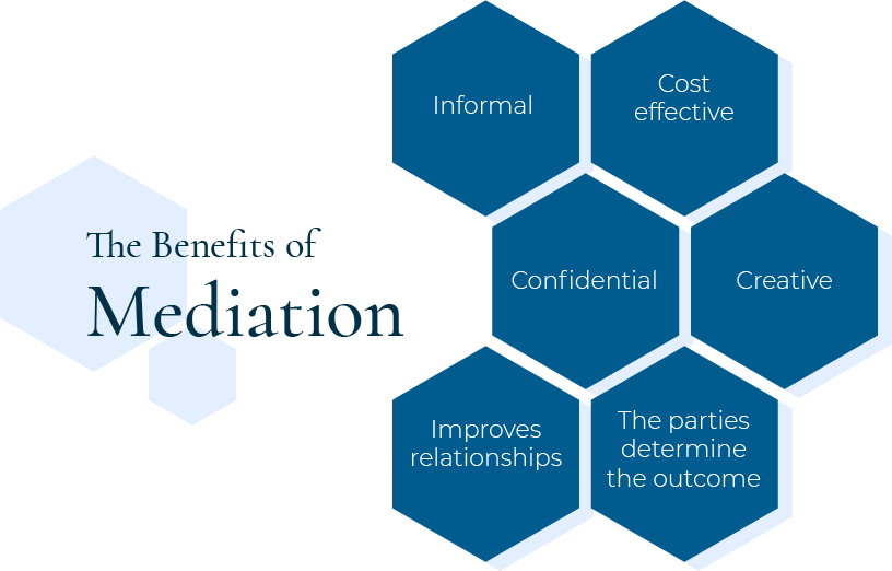 Mediation is a voluntary and confidential process that promotes open and respectful communication with the assistance of a neutral and impartial third party: the mediator. Mediation allows the parties in a dispute to examine their interests and concerns, explore a variety of creative options, and develop mutually satisfactory solutions to problems in a timely and cost-effective manner. With the mediator’s help, the parties determine the outcome and are more likely to be satisfied with the process and the results.