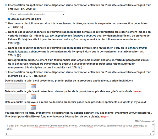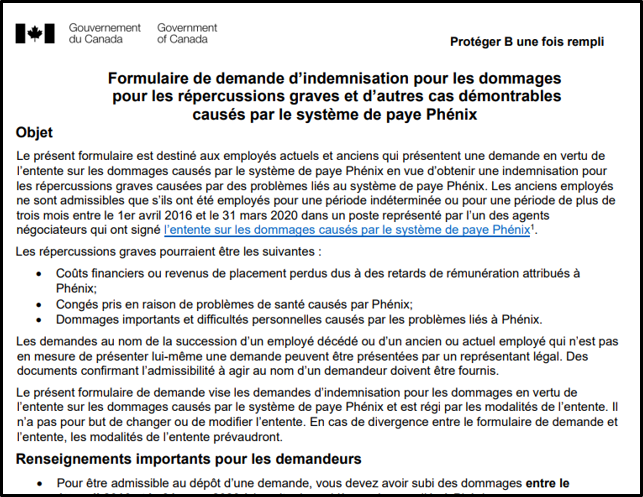 - Vous devez indiquer sur le formulaire « renvoi d’un grief relatif à des dommages pour répercussions graves causés par Phénix »